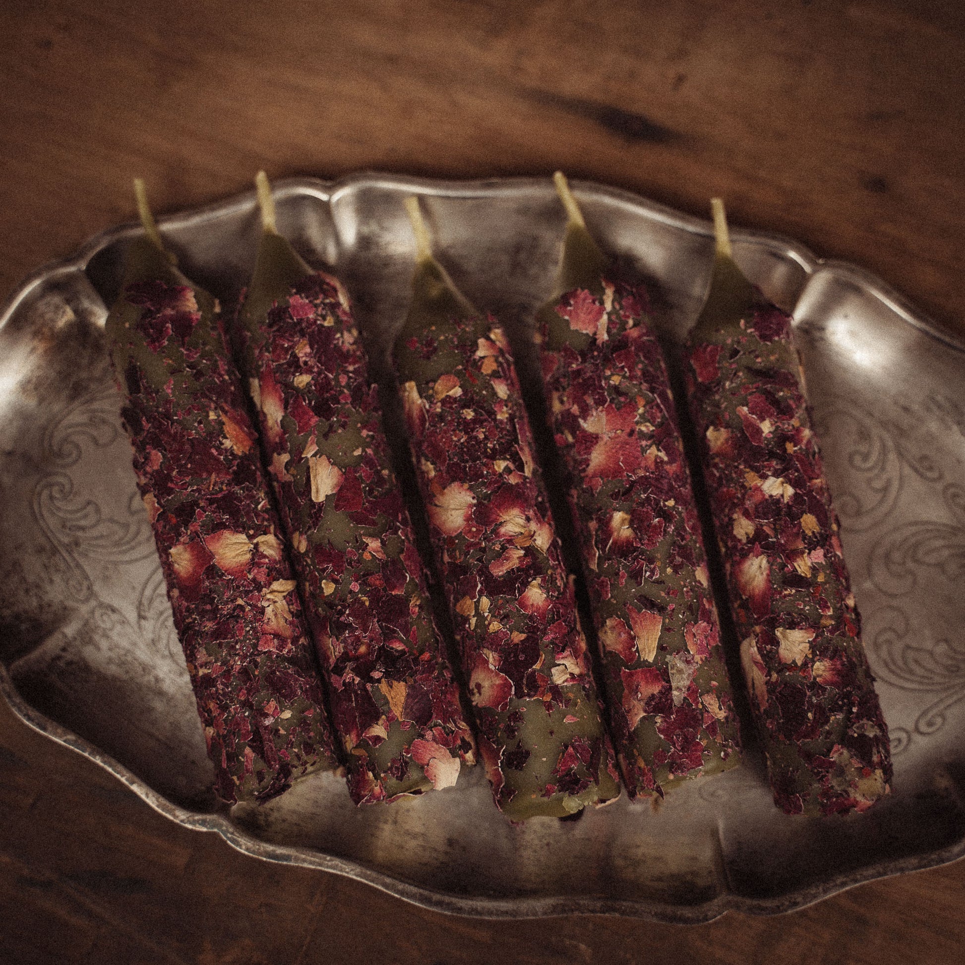 Handgjorda ritualljus gjutna i färgat bivax och rullade i torkad nyponros (Rosa canina) som plockats från min trädgård. En traditionell magisk växt med rötter i keltisk och europeisk folktro som bär en mjuk men kraftfull energi.
