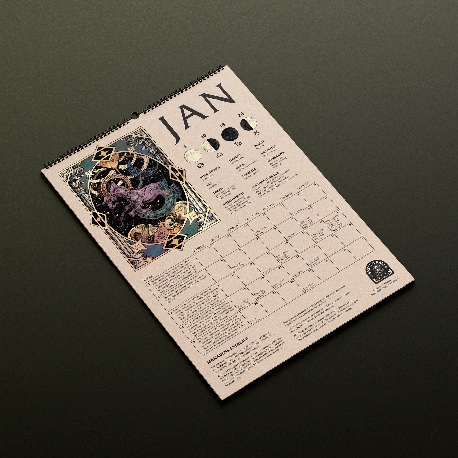 🌙 Förutom 12 förtrollande illustrationer av zodiakens tecken och en vackert illustrerad framsida av Hanna, innehåller kalendern också mängder av astrologiska texter av Alexandra: