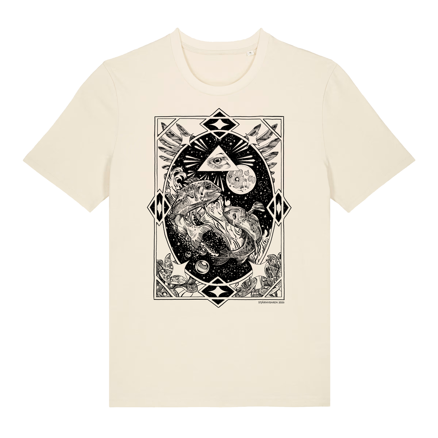Ekologisk naturvit t-shirt framtagen för att bära illustrationerna från Stjärnvisaren 2026 skapade av Hanna Virdarson.