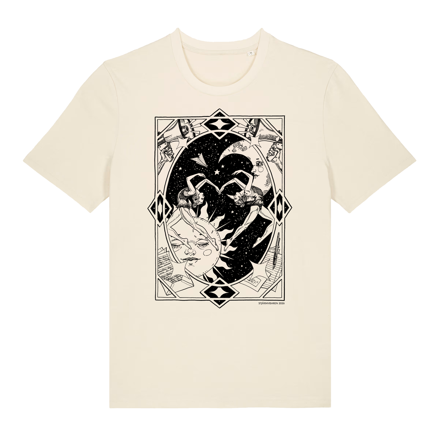 Ekologisk naturvit t-shirt framtagen för att bära illustrationerna från Stjärnvisaren 2026 skapade av Hanna Virdarson.