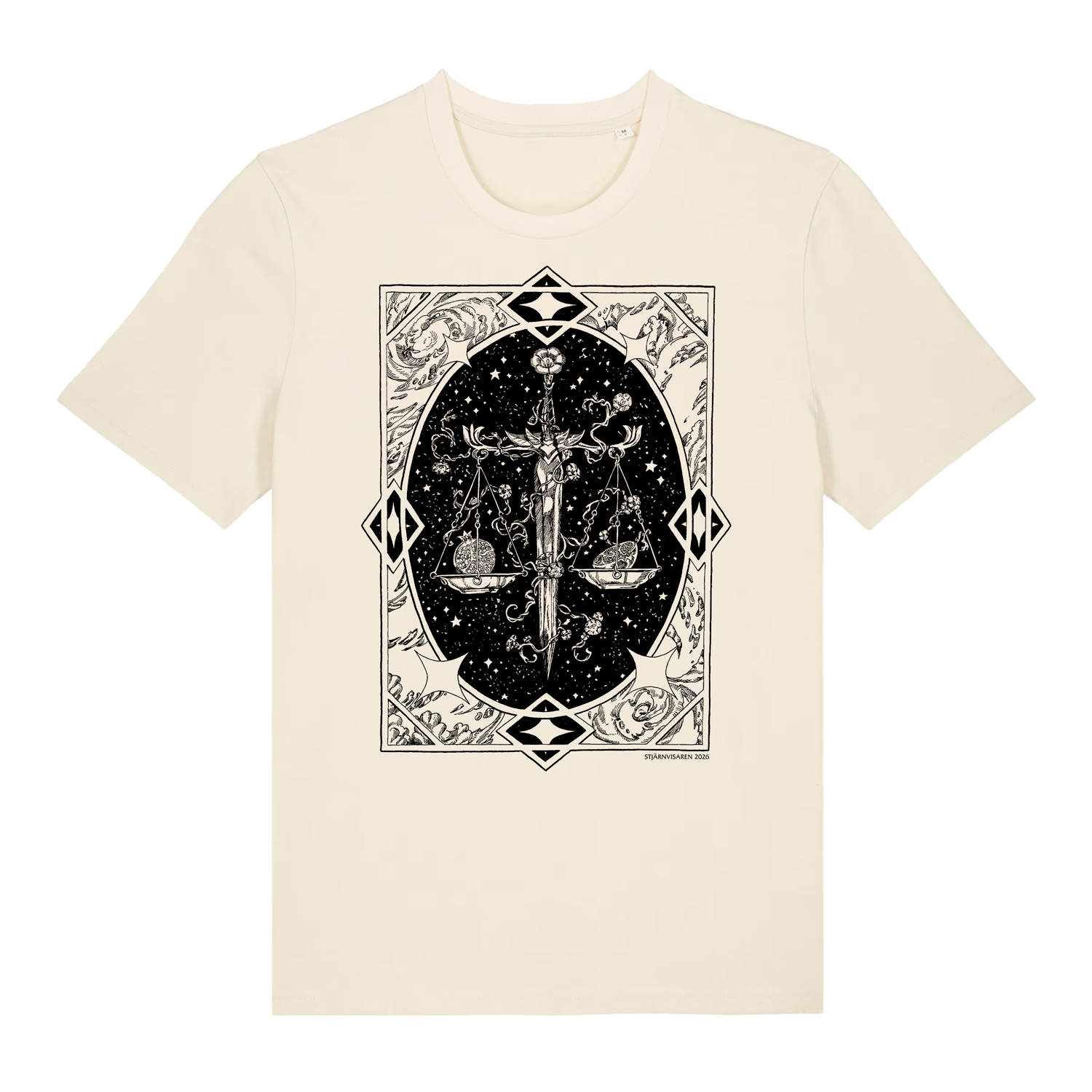 Ekologisk naturvit t-shirt framtagen för att bära illustrationerna från Stjärnvisaren 2026 skapade av Hanna Virdarson.